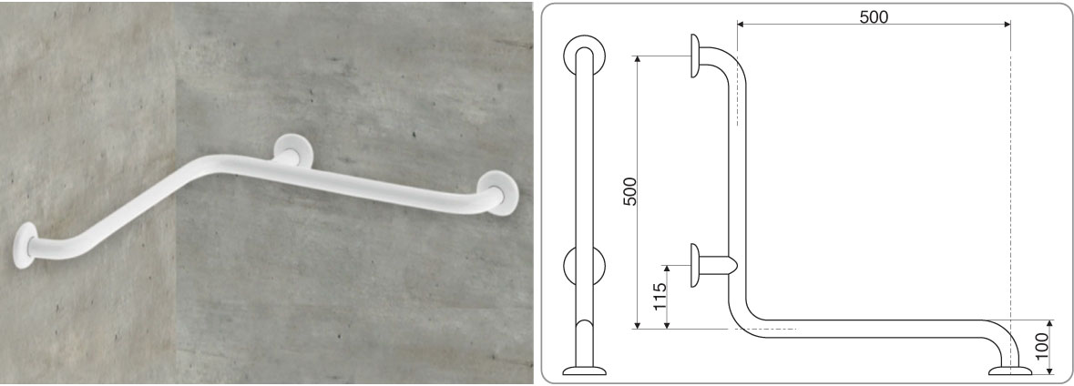 Tipo: Barra fija «esquinera» de seguridad para ser montada en diferentes tipos de muros. Su morfología permite soportar esfuerzos verticales como horizontales.